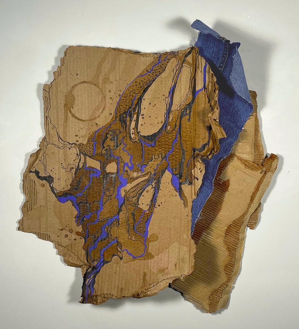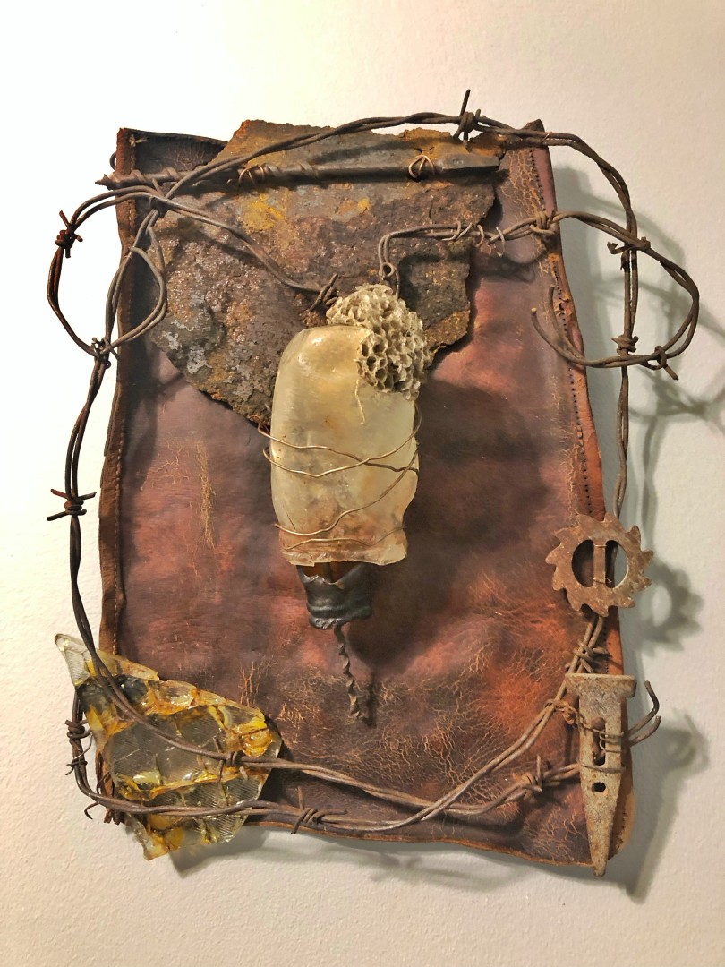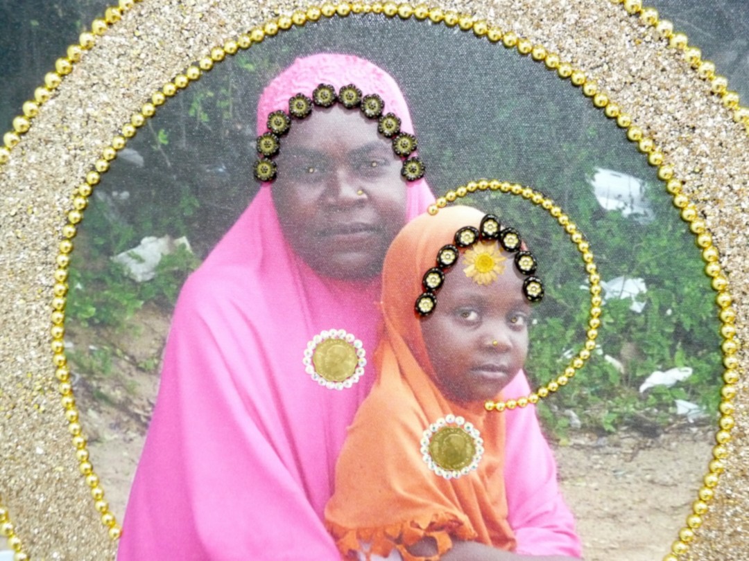 Artist Statement : Original photo taken in early 2025 on Catembe beach in Maputo, Mozambique. The woman and her child were searching for the mother's maternal father. She said her own mother was a prostitute originally from the Comoros Islands who had recently died; her brother took everything she was set to inherit. She was in search of a father she had never met, but who she hoped would save her and her child from poverty. On this rubbish-filled beach, I did the best I could to offer them food and to try to set them back towards the most likely places to look. Not only are the subjects a reflection of items lost and found, but the act of assemblage offers a redemptive and transformational character to their image. Divorcing the image from its origin story offers visual novelty, tactile realism, and a under tone of religious suffering. Mixed media tile and embellishments with dried flowers, coins, beads, etc., completed at Arts, Letters & Numbers Residency in July-Aug 2025 in upstate New York.